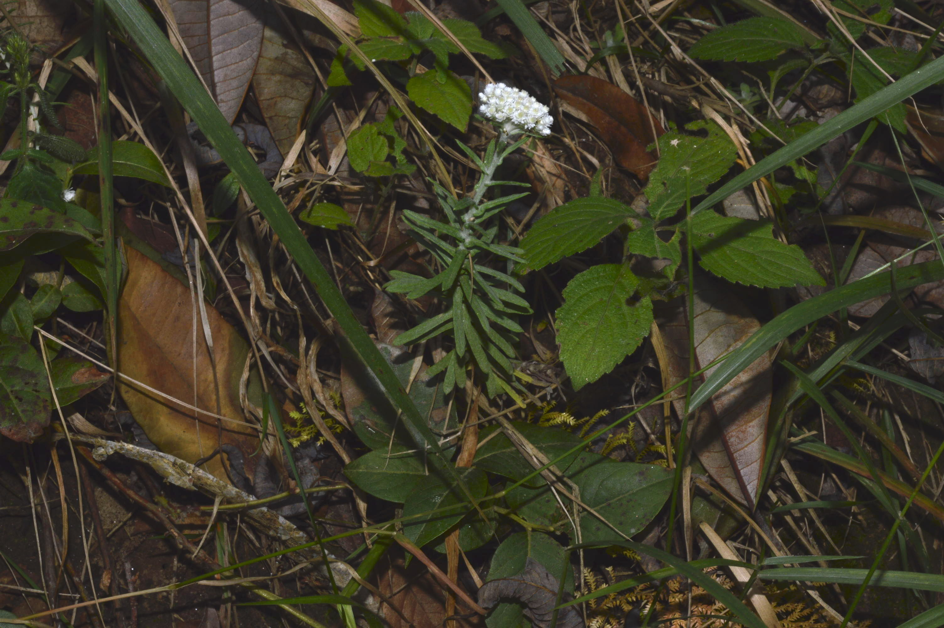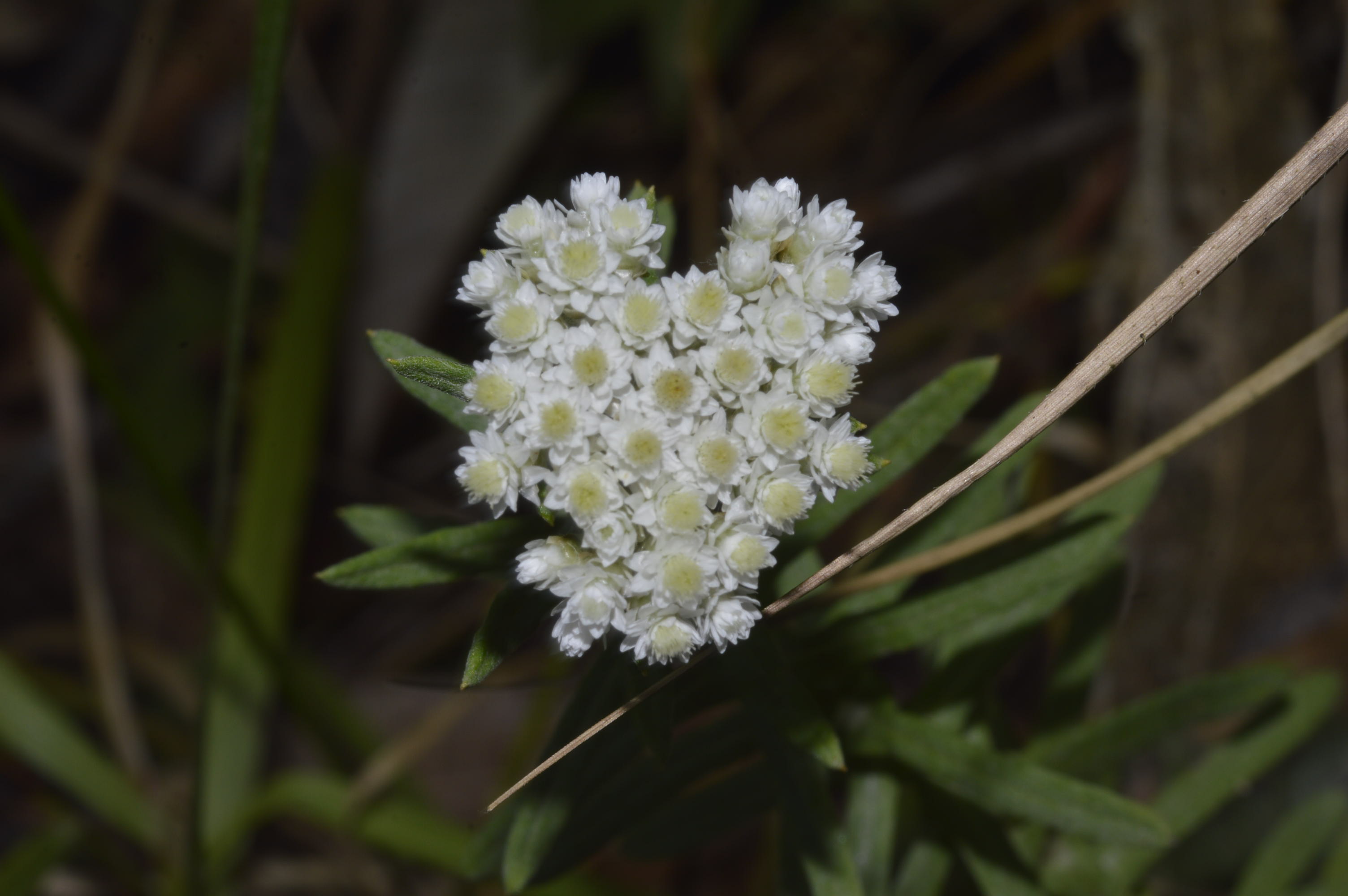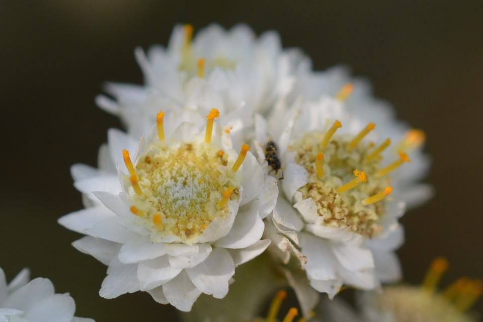 Flowers are nearly spherical, arranged in rounded, densely crowded corymbs. Tiny yellow florets are surrounded by shiny white bracts.
