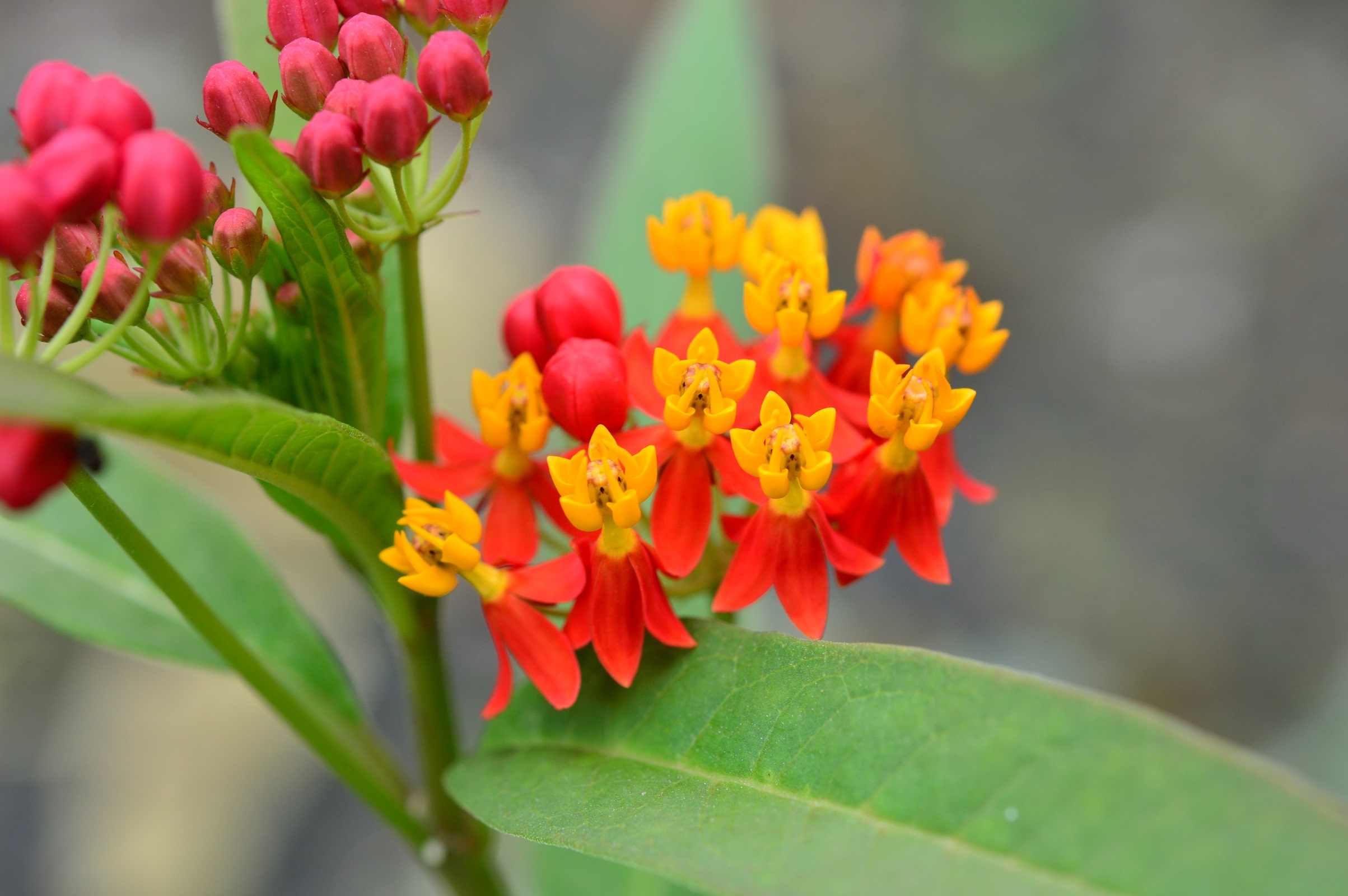 Flowers are in clusters called umbels. These clusters typically hold 6 to 12 individual flowers and are positioned at the terminal ends of stems or in the axils (crooks) between leaves. The blossoms are red and orange.