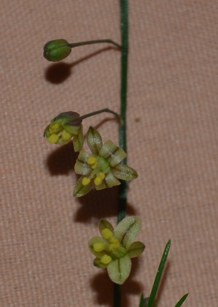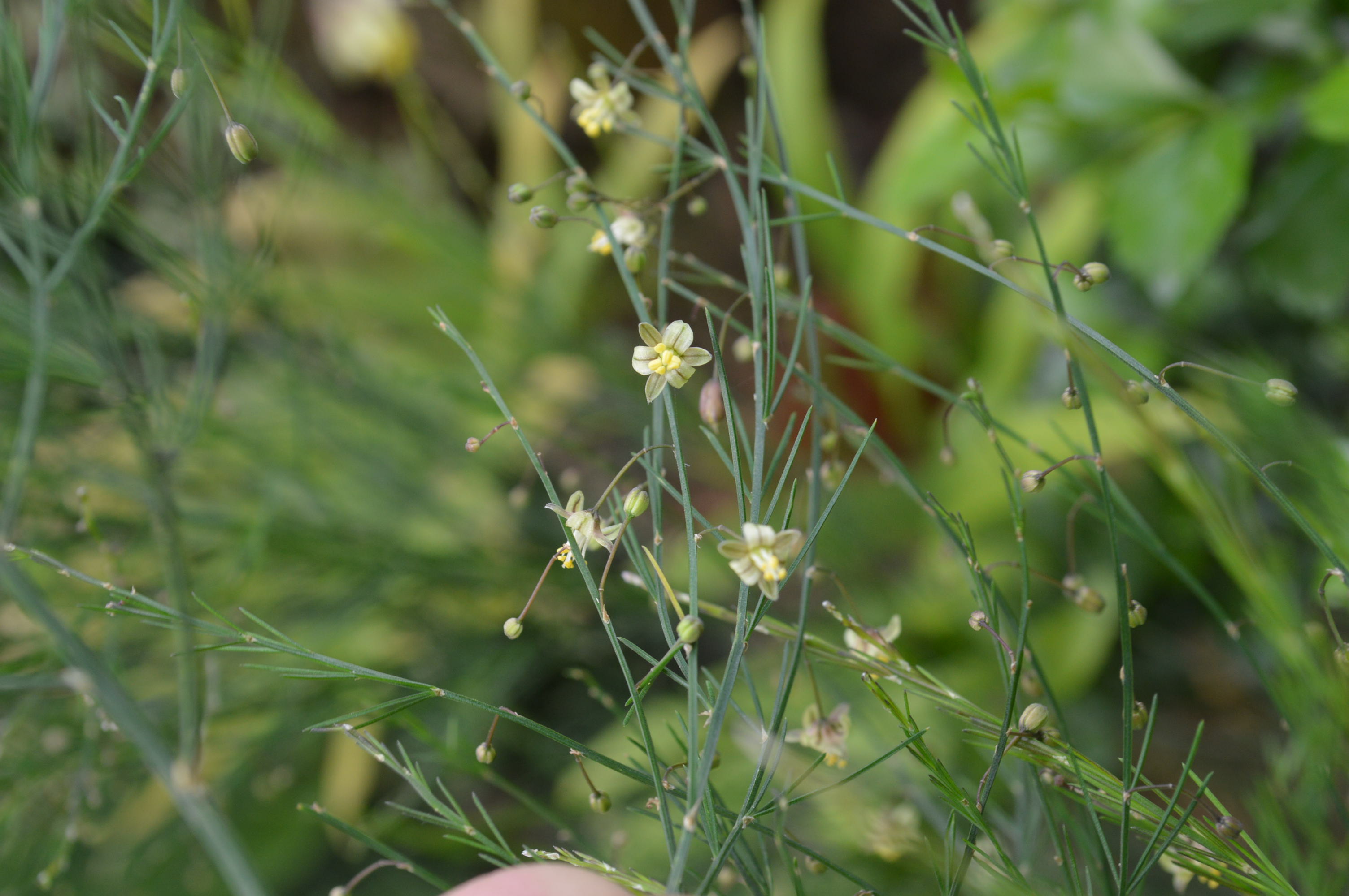 It has tiny scales at the base of the stems (leaf spurs). The true foliage consists of feathery structures called cladodes, which emerge in clusters of 3-6 from each joint. These needle-like cladodes are 0.5-3 cm long and very thin (0.2-0.4 mm), with a slightly flattened surface and irregular grooves.