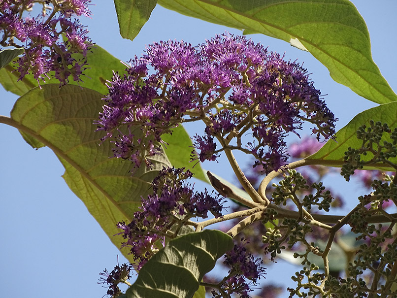 Small, purple, and borne in dense clusters.