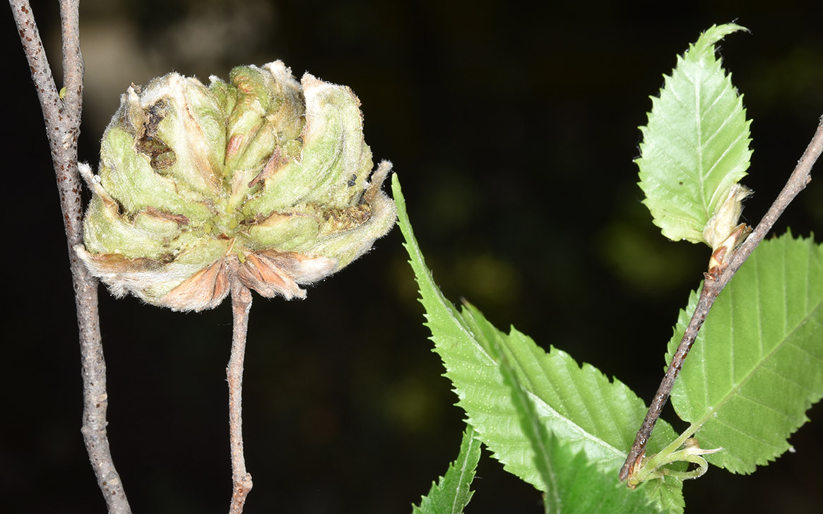 Leaves elliptic, oblong, or lanceolate - and measure 6-11 cm long by 3-5 cm wide. They have a distinctive pointed tip with jagged edges (doubly serrated). The upper surface is smooth, while the underside has some fine hairs, especially near the veins. Slender stalks (1.5-3 cm) connect the leaves to the branches.