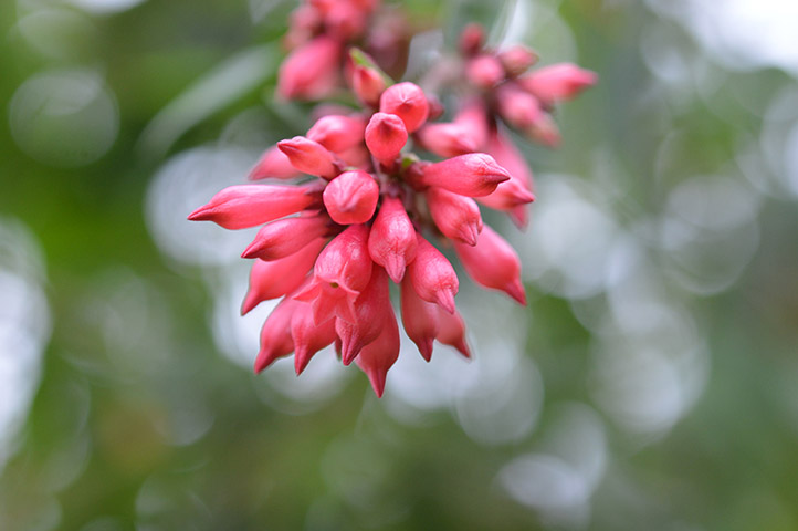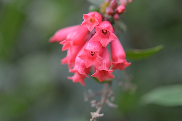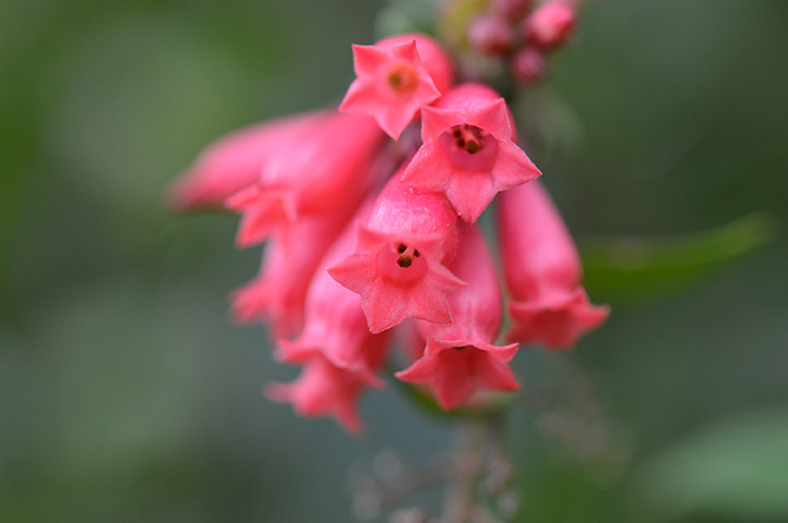 Odorless, red/pink/violet, 2 cm long. Hairless, narrow bell-shaped calyx. Petals flare up, narrow at throat. Erect clusters at branch tips or leaf axils.