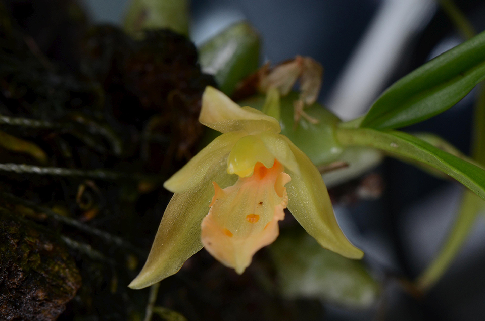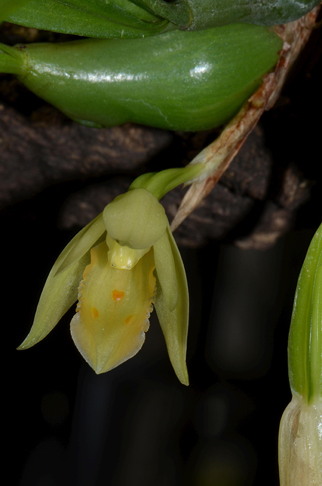 Flowers are solitary, 2 cm across, emerging from a short stalk at the base of the pseudo-bulb. Sepals and petals greenish-yellow, lip with orange spots, base bright yellow, adorned with a few orange spots.