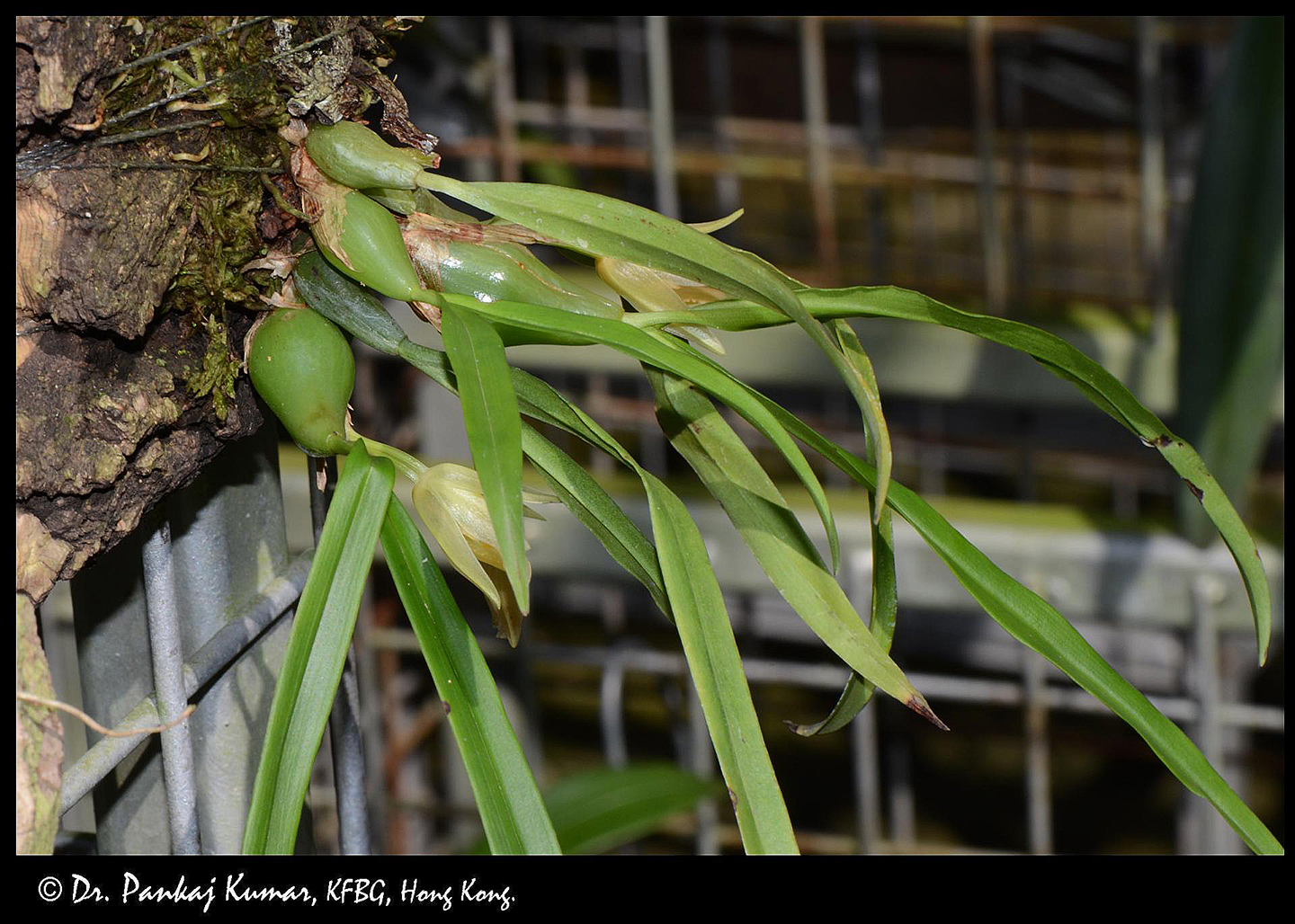 Leaves are two per pseudo-bulb, narrowly oblong, tapering, stalkless, 4-6 cm long and 1-1.5 cm wide.
