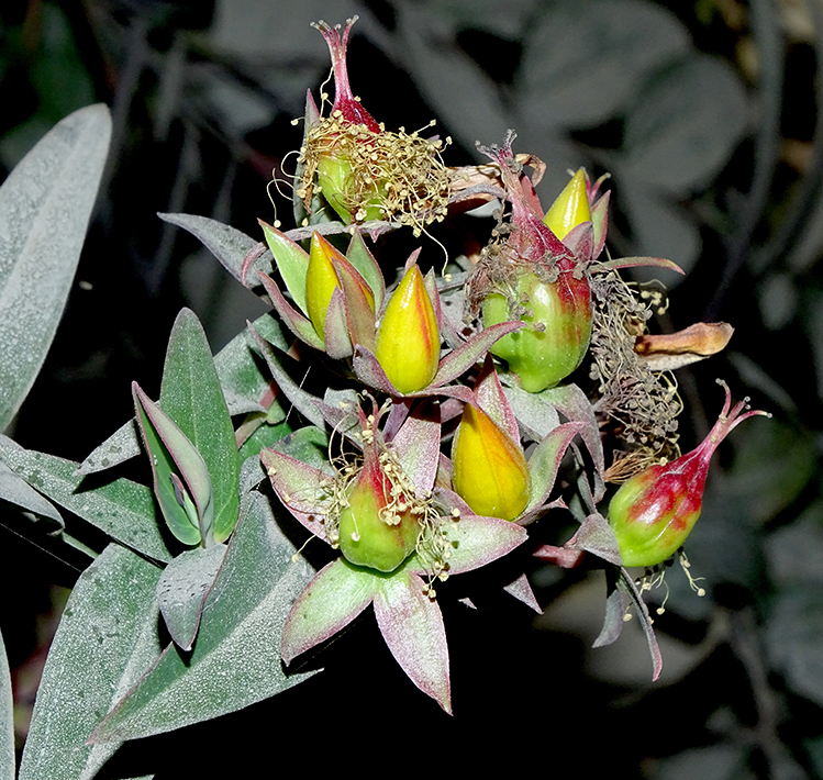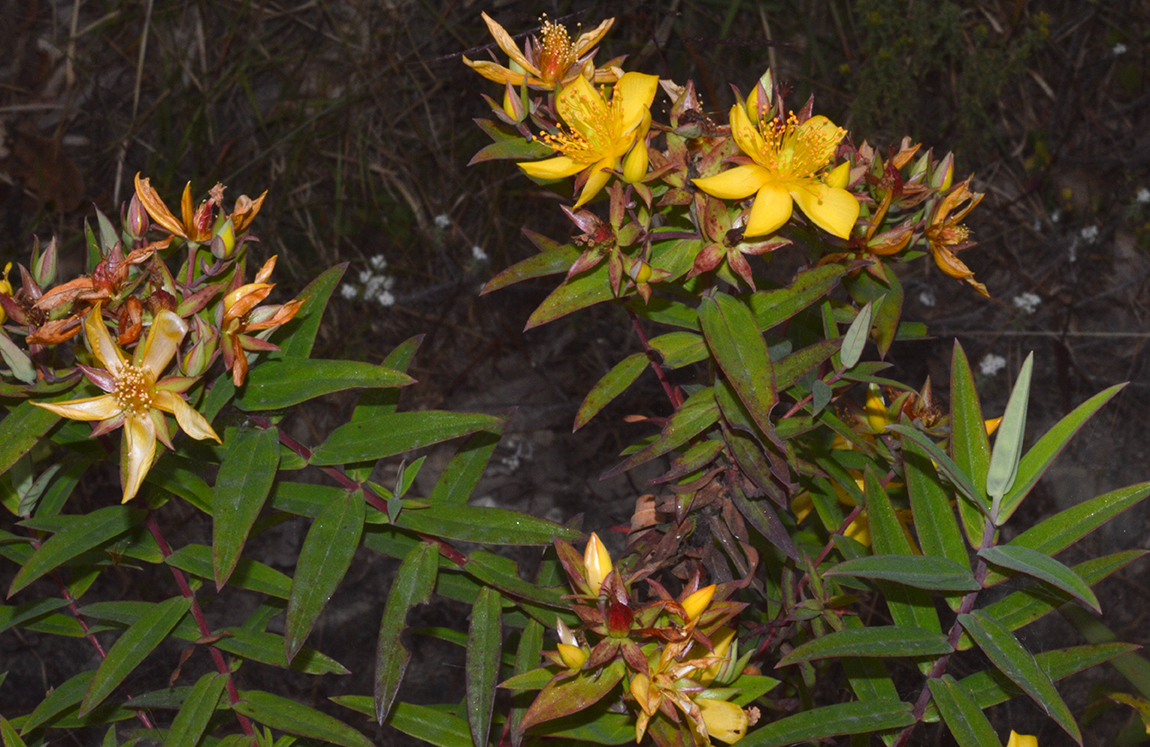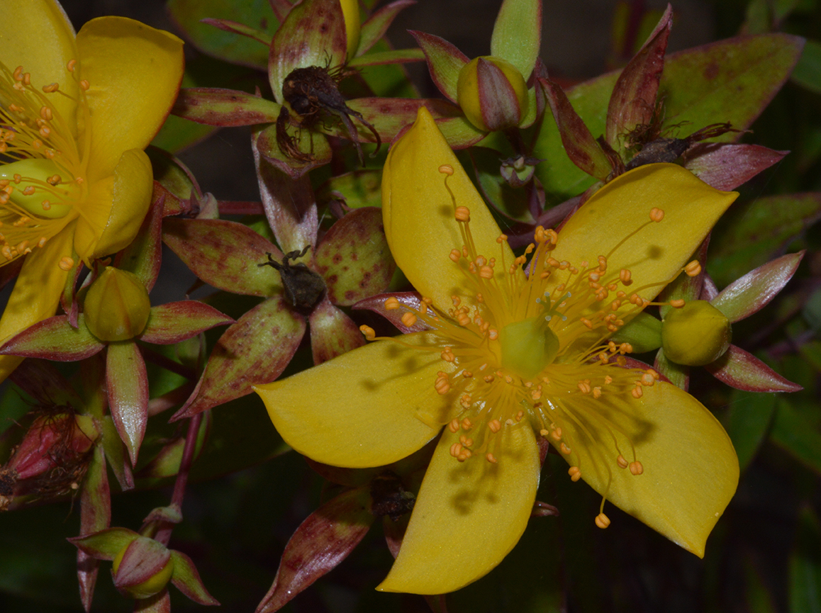 Flowers are yellow, borne in few flower clusters at the end of branches. Individual flowers are 3-4 cm across, petal obovate, longer than sepals, stamens numerous in five clusters.
