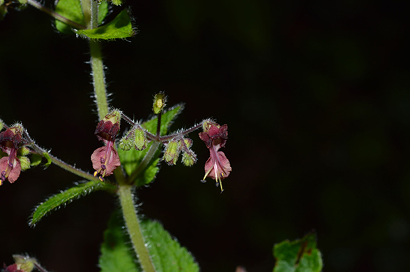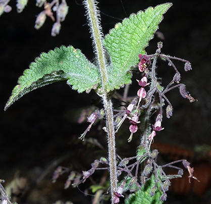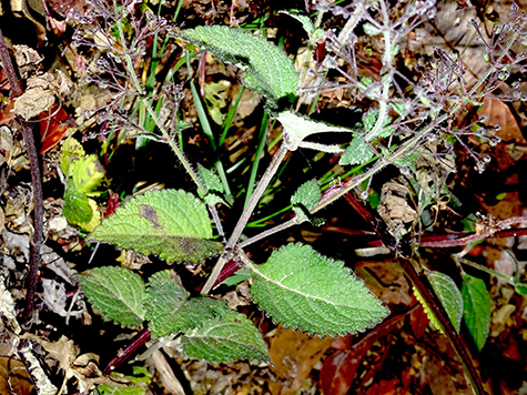 Leaves are oppositely arranged on the stem and are often strongly aromatic when crushed. They are generally simple and ovate in shape, with a tapering tip, prominent venation, and serrated (toothed) margins.
