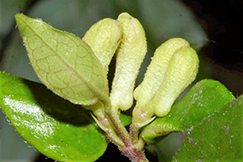 Leaves are opposite, simple, elliptic to oblong-elliptic, glossy green, leathery. They are 3-8 cm long and 1-3 cm wide.
