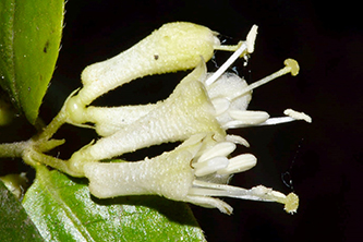 Flowers are small, white or cream-colored, tubular flowers with five lobes, borne in clusters at the terminal ends of branches. Flowers are about 1-2 cm long.