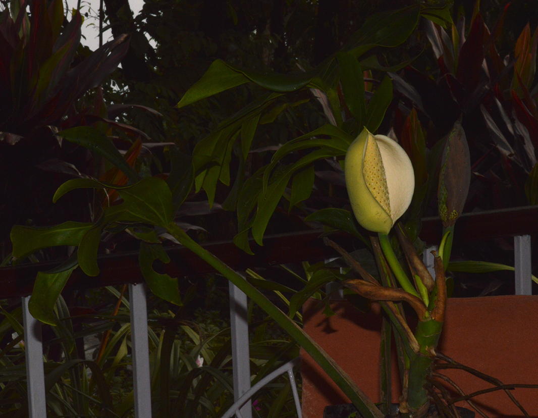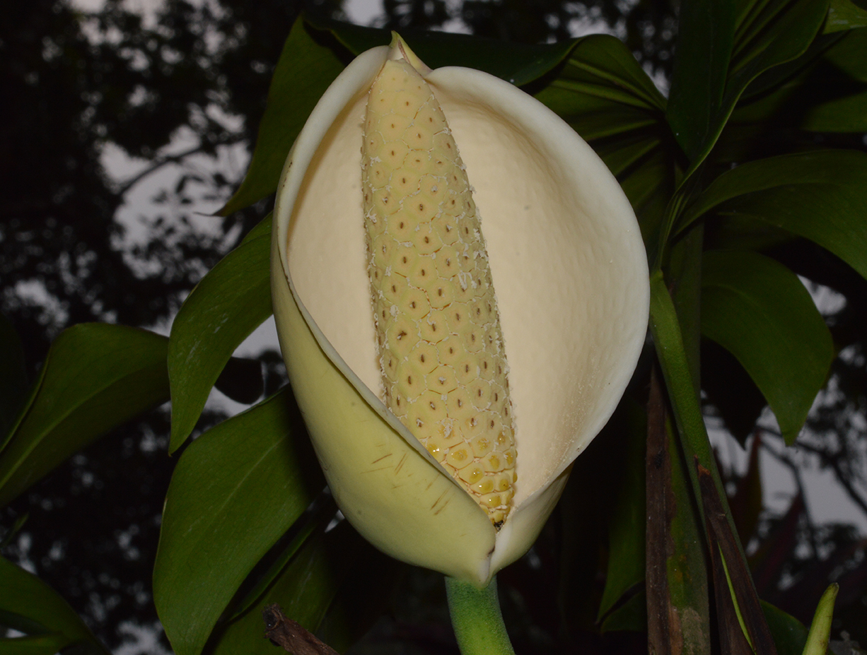 Flowers are like huge arum lilies, appear on short thick stems during the summer if the humidity conditions are good.