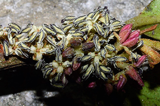 Flowers are 3 mm across, reddish to white, in dense fascicles in leaf axils. Flower-stalks are 1-2.5 mm long. Sepals and petals are 4-5. Stigmas are 2-3-lobed, with flat, spreading, frilly lobes.