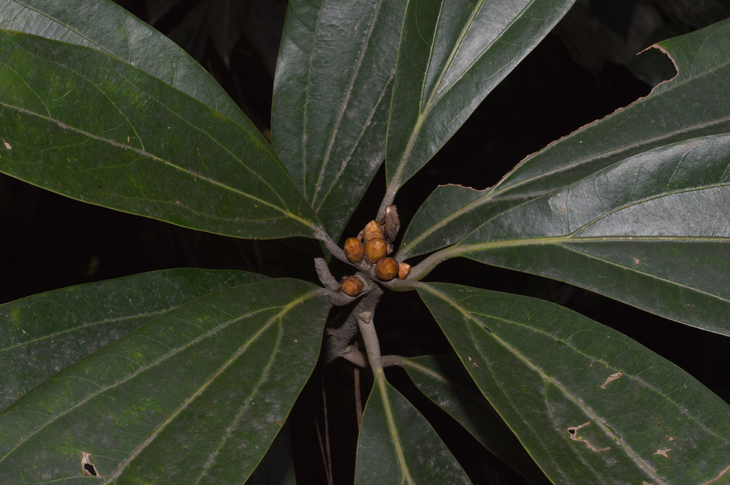 Leaves are nearly circular in arrangement on the stem, thick and leathery to papery in texture. Obovate to oblong, measuring 3-5 cm wide and 12-19 cm long, tapering towards the tip with a pointed base. Upper leaf surface is smooth, while the lower surface is paler with soft, sparse hairs. Leafstalk is slender, about 1-1.5 cm long.