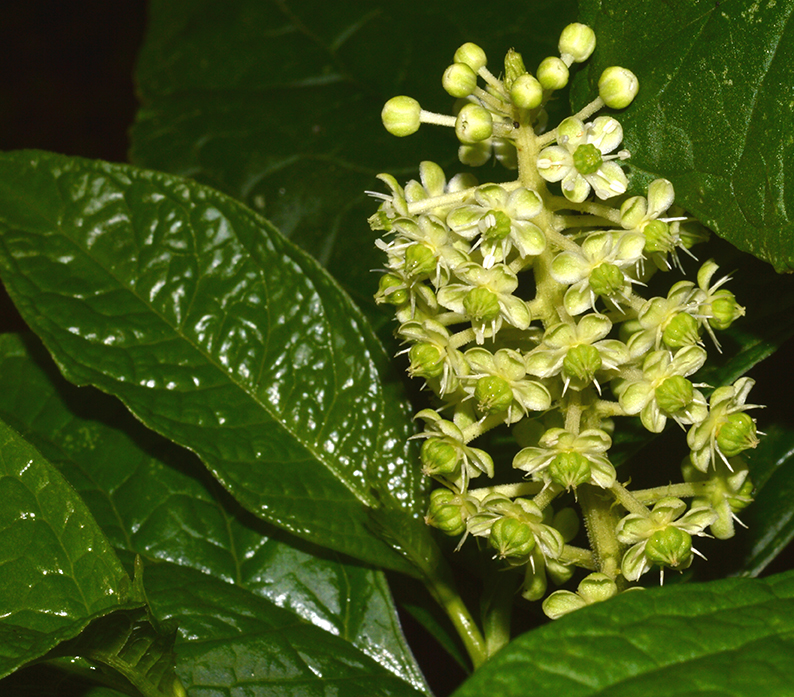 Small, fleshy berries that ripen from green to purplish-black, containing red juice and small seeds.