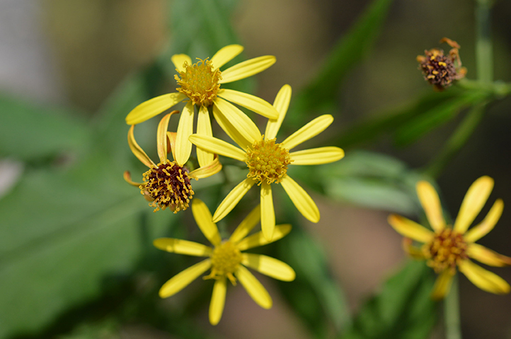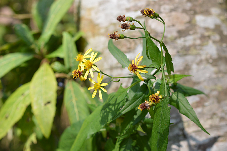 Flowers are numerous, bright yellow flower heads in loose, domed clusters at branch tips and sides. Lower flower heads are smaller with few ray florets (around 0.5 cm). Bracts (involucral bracts): Linear-oblong shaped, pointed, and nearly hairless.