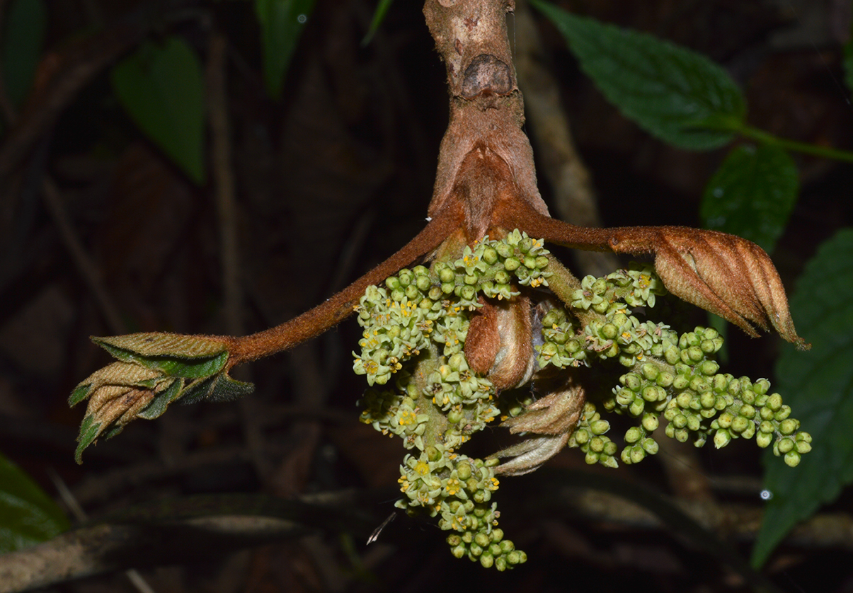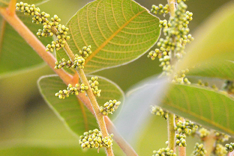 Flowers are borne in leaf-axils or in branch-end panicle, densely woolly, much shorter than the leaves. Flowers are insignificant, dirty white.