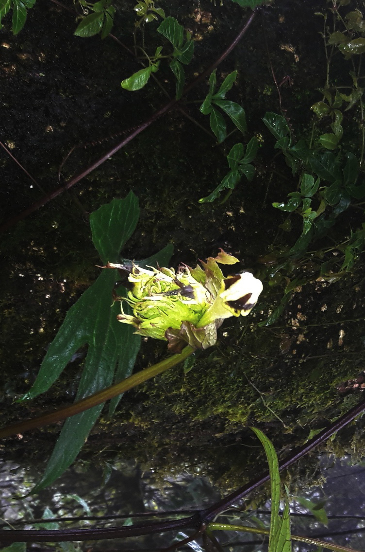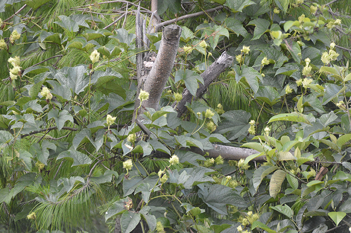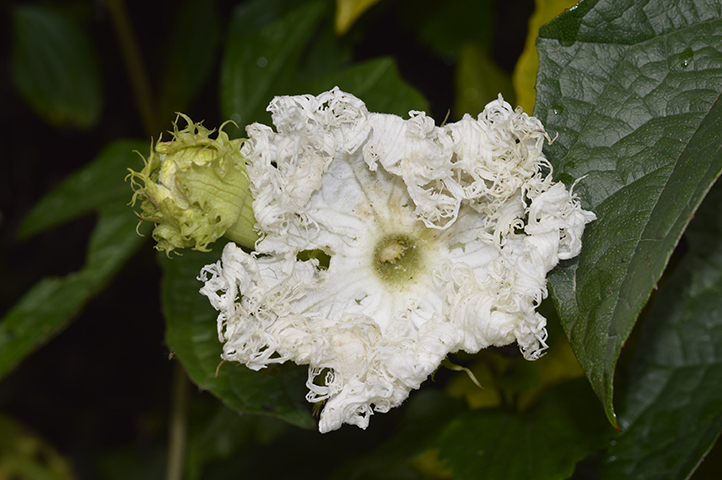 Leaves are large, round with 5-7 deep lobes. They are about 18-20 cm wide and long, with a rough upper surface and smooth underside.