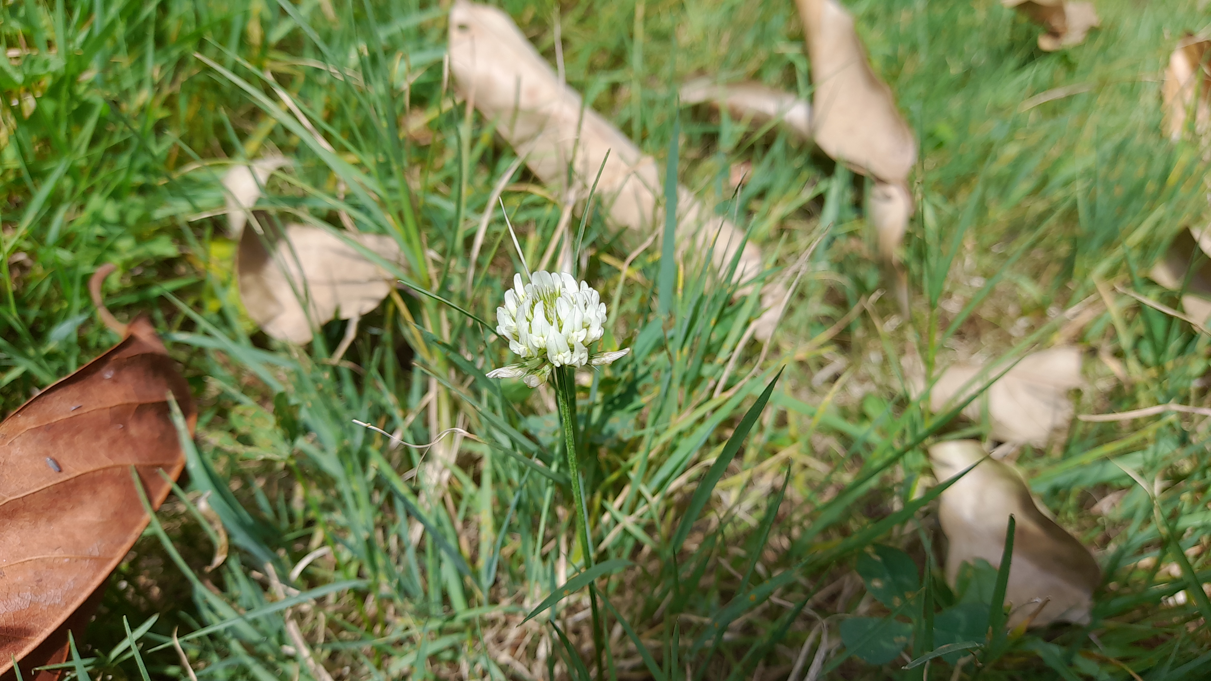 Leaves are trifoliate (three leaflets), with each leaflet obovate or broadly elliptical in shape. They are typically 1-3 cm long, with a smooth margin and a characteristic white mark in the center.