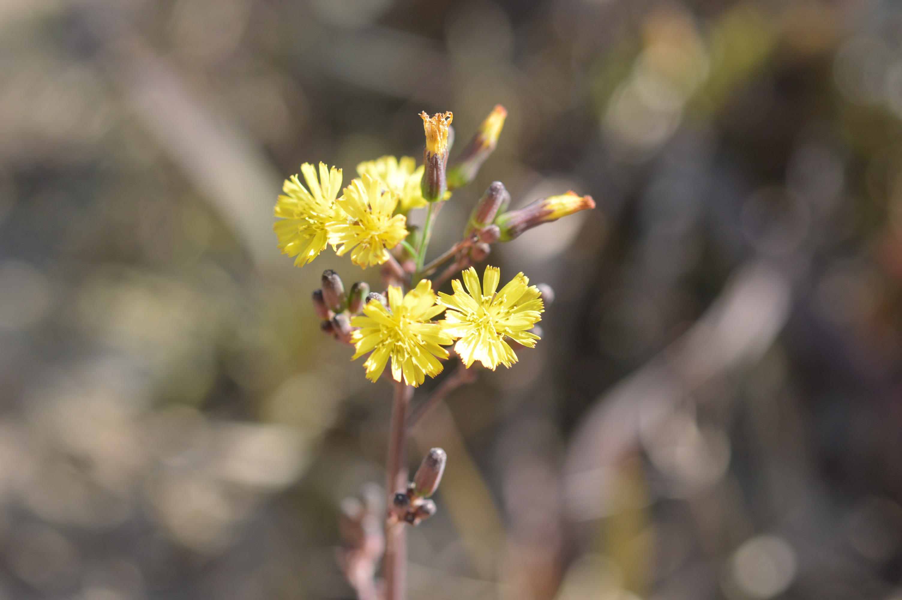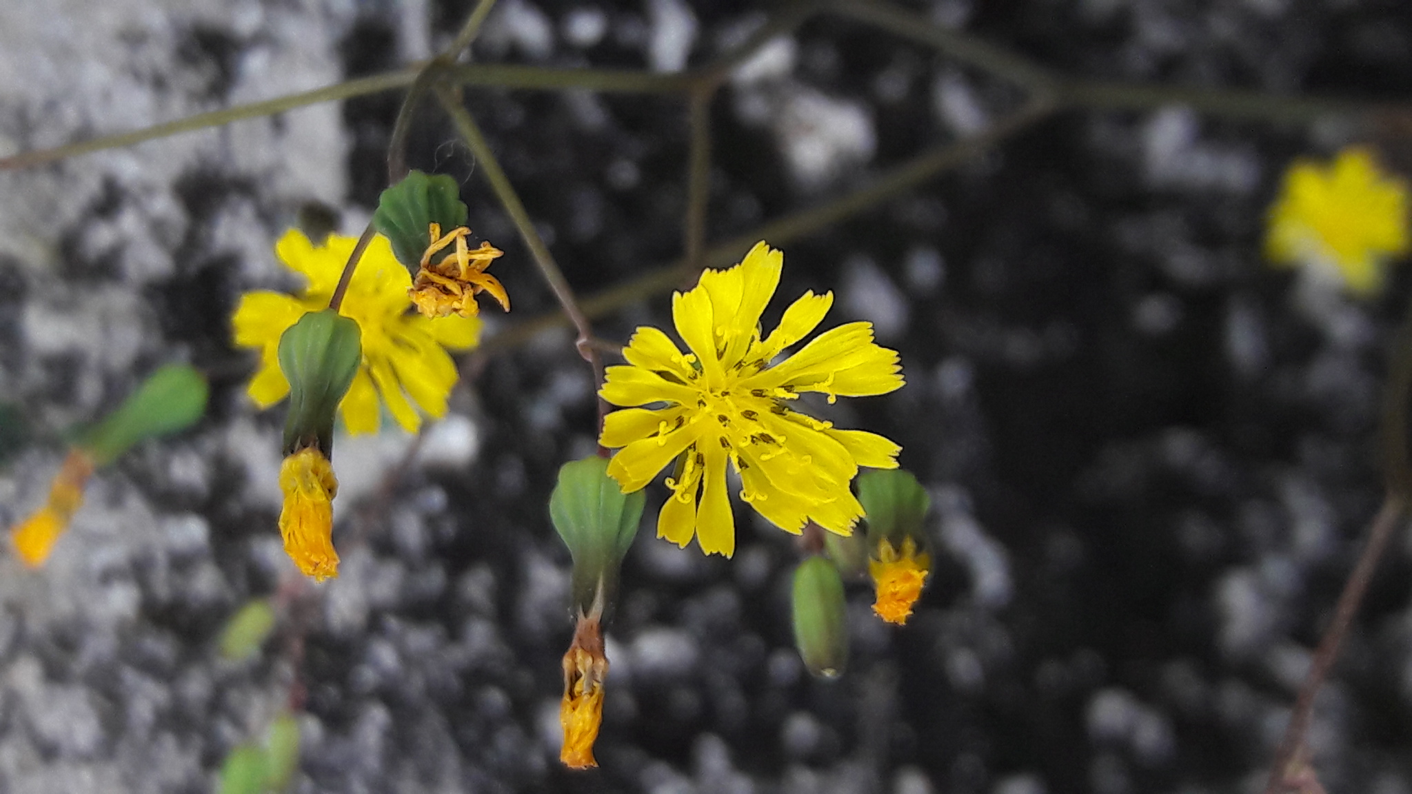 Flowers are numerous yellow flower heads, arranged in clusters called corymb-like panicles. Involucral bracts: 6-8, narrowly oblong shaped, green, and erect. Florets: Yellow, numbering 10-20 per flower head.